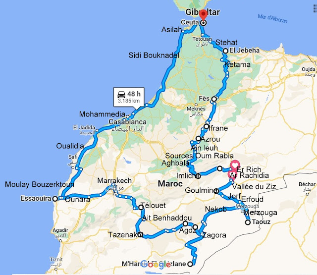 La boucle est bouclée. Nous quittons le Maroc après avoir passé 7 semaines à sillonner ce pays et fait 3 260 km. C’est notre quatrième voyage au Maroc et on ne se lasse pas d'explorer ce magnifique pays aux paysages tellement diversifiés, aux routes de montagne sublimes et en plus avec un lot de rencontres imprévues et oh combien accueillantes, généreuses, géniales...